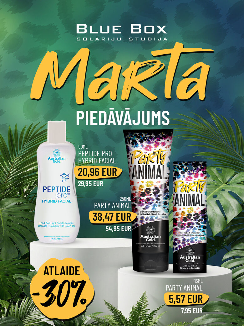* piedāvājumā Australian Gold Peptide Pro Hybrid Facial 90ml un Party Animal 15ml un 250ml ar 30% atlaidi